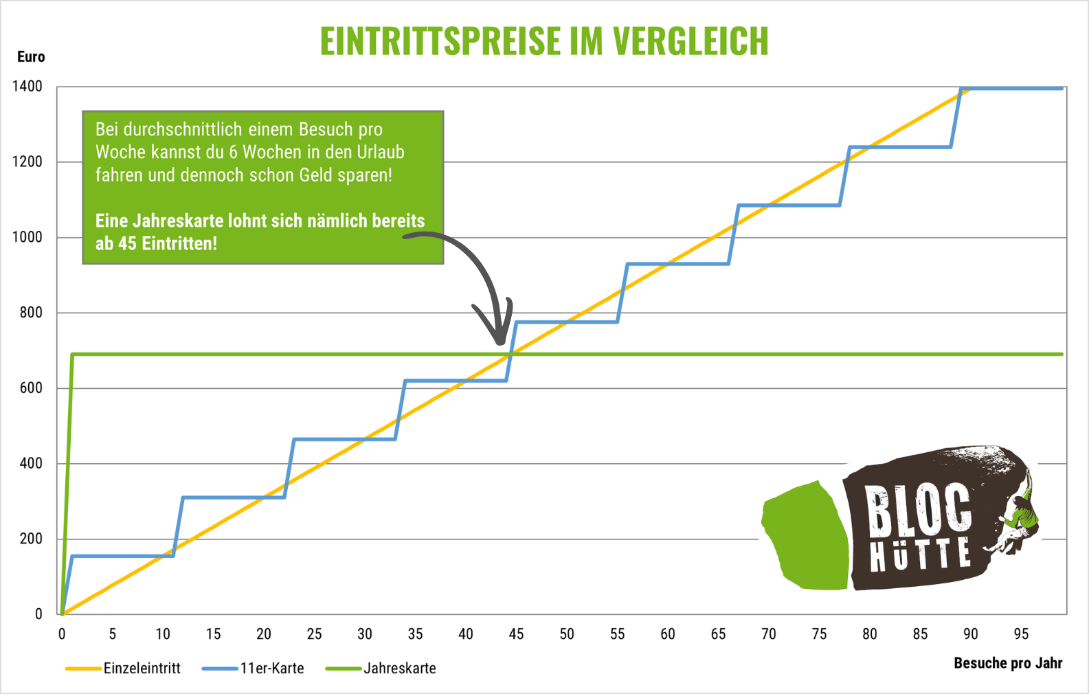 Bei durchschnittlich einem Besuch pro Woche kannst du 6 Wochen in den Urlaub fahren und dennoch schon Geld sparen! Eine Jahreskarte lohnt sich nämlich bereits ab 45 Eintritten!